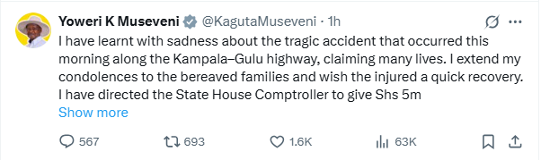 In his statement, President Yoweri extended his condolences, directing Ush5m (184,350) to the bereaved families and Ush1m (36,870) to those injured.