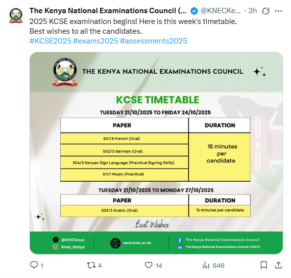 More than 996,000 candidates will officially begin their Kenya Certificate of Secondary Education (KCSE) examination on Tuesday October 21, 2025, marking the start of one of the most important academic seasons in the country.