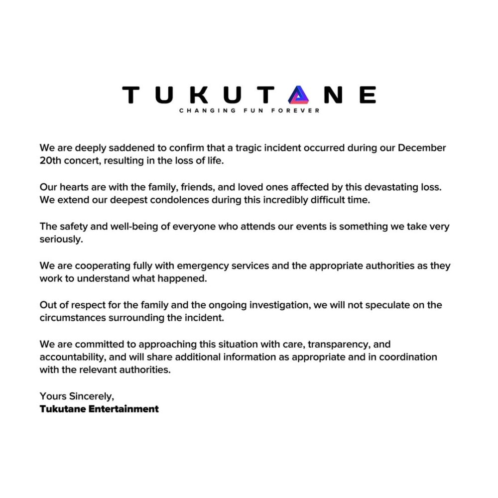 In an official statement, event organisers Tukutane Entertainment confirmed that a fatal incident occurred during the concert.