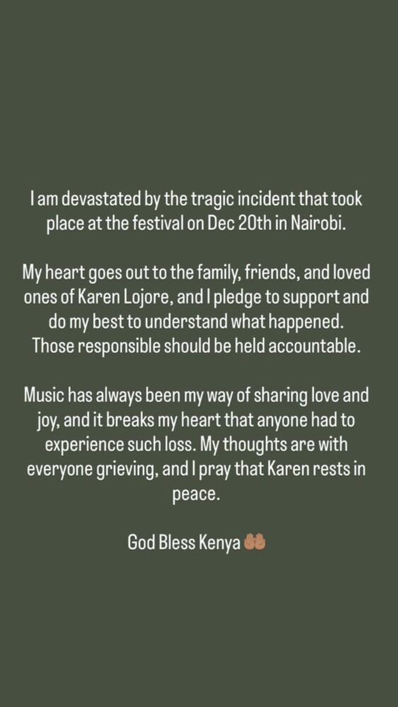 Asake also addressed the tragedy through an emotional message shared on his Instagram Stories. “I am devastated by the tragic incident that took place at the festival on Dec 20th in Nairobi,” the artiste wrote.