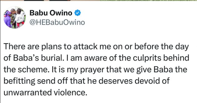 While Owino has not produced evidence of the alleged threats, his comments come amid heightened national tension and political activity following the death of former Prime Minister Raila Odinga, a close ally whose burial is expected to draw thousands.