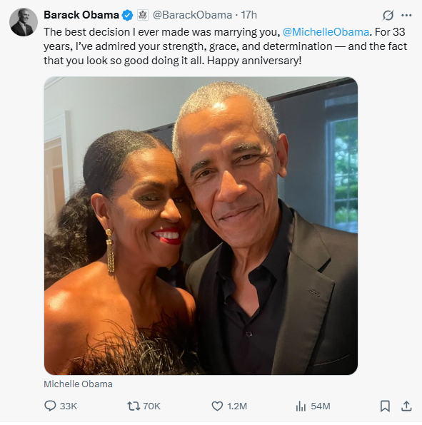 Former U.S. President Barack Obama and his wife Michelle melted hearts across the globe after sharing touching tributes on social media to celebrate their 33rd wedding anniversary a milestone that sparked admiration and nostalgia among millions.