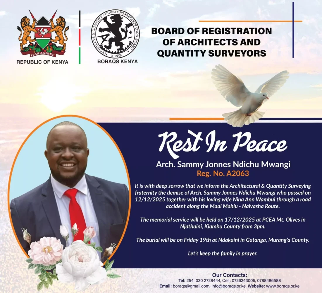A family in Ndakaini village, Gatanga, Murang’a County, is mourning the sudden death of Sammy Jonnes Ndichu and his wife, Nina Wambui Ndichu, who tragically passed away in a road accident on December 12, 2025, along the Maai Mahiu–Naivasha route.