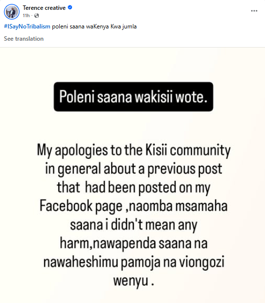 Kenyan digital content creator Terence Creative has issued a public and emotional apology after facing significant backlash over a post concerning the Kisii community.