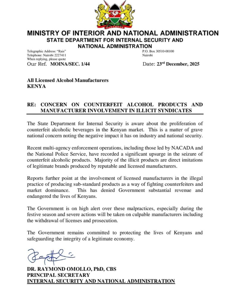 The Ministry of Interior and National Administration has issued a stern warning to all licensed alcohol manufacturers over the rising circulation of counterfeit alcoholic products in Kenya, citing serious threats to public safety, national security, and government revenue.