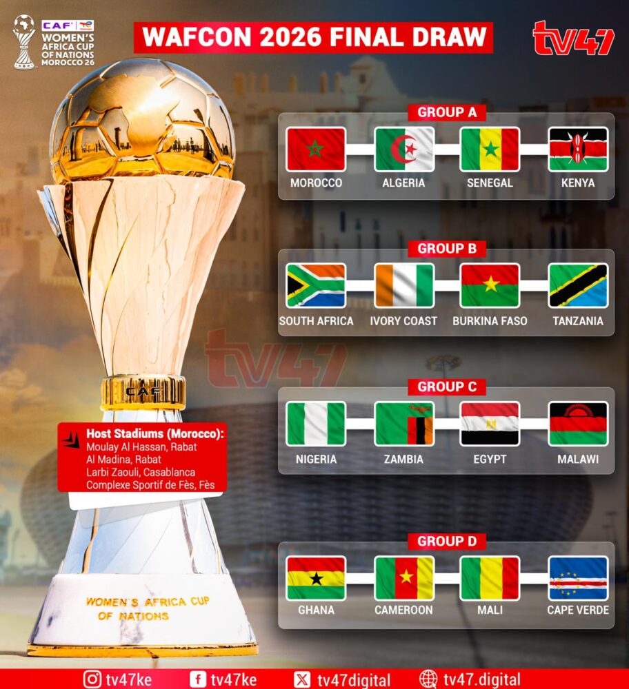 Kenya’s Harambee Starlets have been handed a demanding test at the 2026 Women’s Africa Cup of Nations (WAFCON) after being drawn in Group A alongside hosts Morocco, Senegal and Algeria.