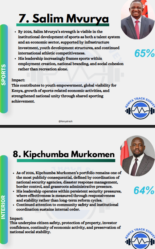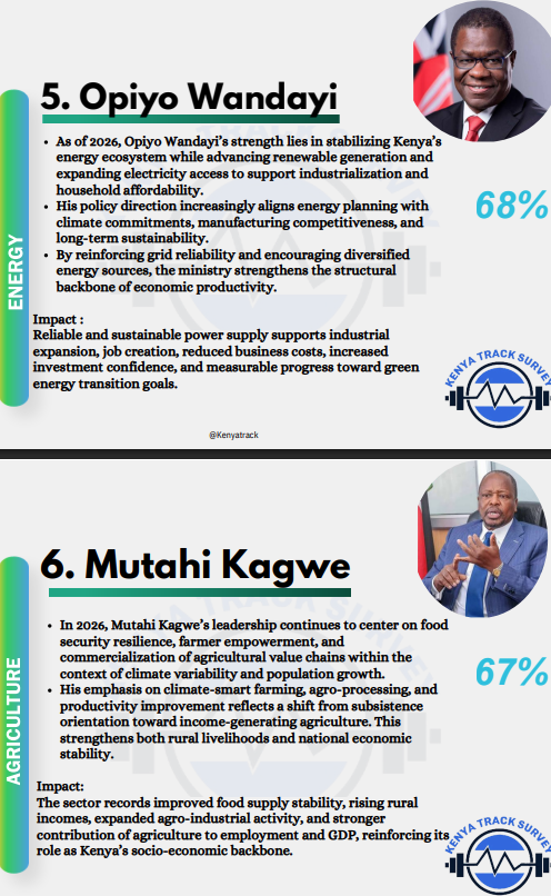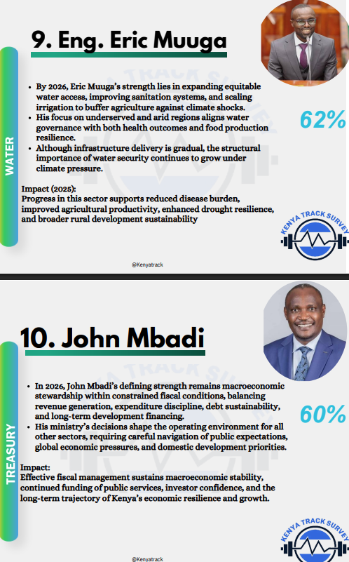 Closing the rankings, CS John Mbadi, with 60%, remains central to macroeconomic stability. By balancing revenue generation, expenditure discipline, debt sustainability, and long-term development financing, his stewardship ensures fiscal stability, sustained public service funding, and investor confidence, providing the foundation for all other sectors to thrive.