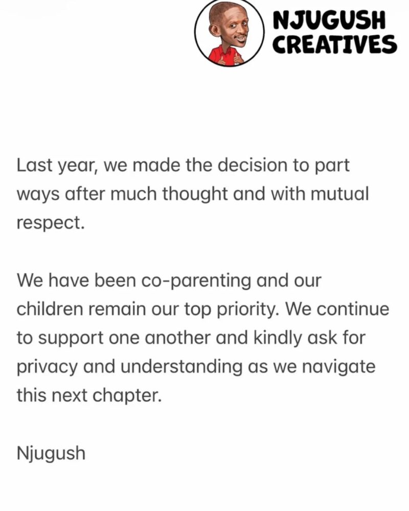 In a statement shared through their business venture, Njugush Creatives, the comedian revealed that the decision to separate had been made privately in 2025, following careful consideration and mutual respect.