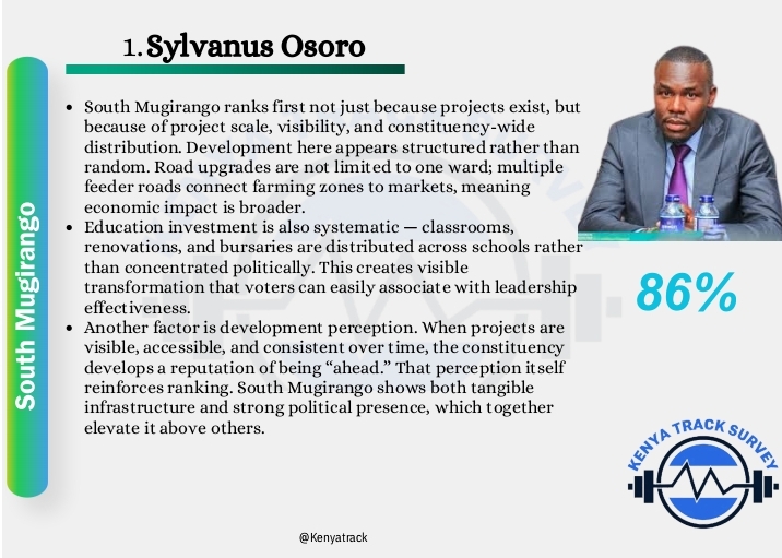 The Kenya Track Survey shows that constituencies with visible infrastructure expansion, structured bursary programs and broad distribution of development projects across wards rank higher in performance perception.