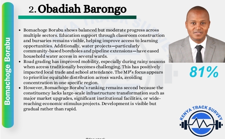 Bomachoge Borabu MP Obadiah Barongo ranks second with 81 percent, reflecting balanced progress across several sectors. Education support through classroom construction and bursaries remains visible, while water projects including boreholes and pipeline extensions have improved household access in several wards. Road grading has also enhanced mobility and supported local economic activity, although the constituency lacks major large-scale infrastructure projects.