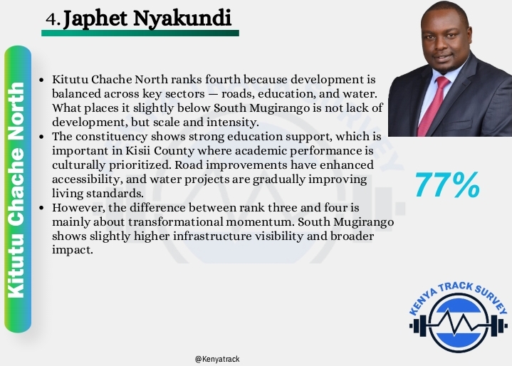 Kitutu Chache North MP Japhet Nyakundi ranks fourth with 77 percent, with development described as balanced across roads, education and water projects. School infrastructure improvements remain a strong pillar while road upgrades have enhanced accessibility and water projects continue to improve living standards. The constituency shows steady development progress but with slightly lower infrastructure visibility compared to the top-ranked areas.