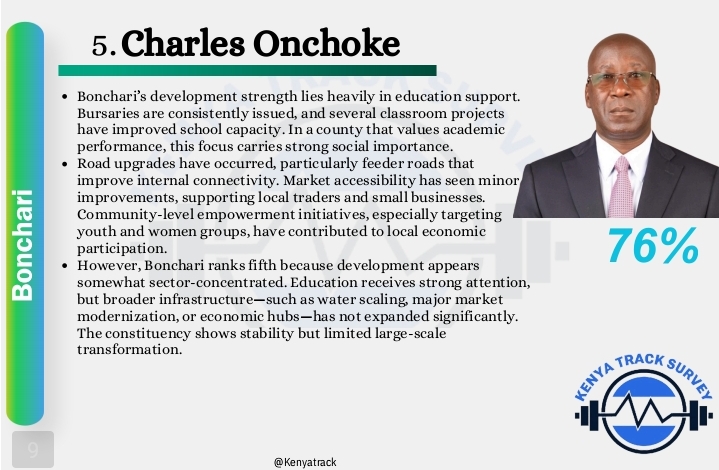Bonchari MP Charles Onchoke ranks fifth with 76 percent, with development strongly anchored in education support. Consistent bursary programs and classroom construction projects have expanded learning capacity, while feeder road improvements have strengthened connectivity. Empowerment programs targeting youth and women groups have also supported economic participation, although development remains concentrated mainly in the education sector.