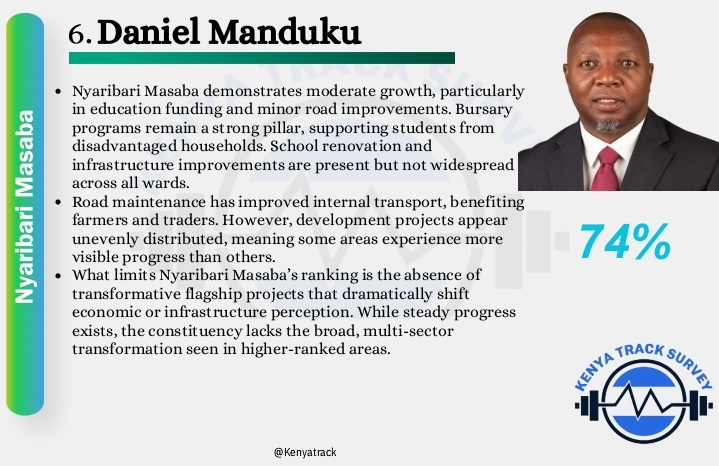 Nyaribari Masaba MP Daniel Manduku ranks sixth with 74 percent, reflecting moderate development progress particularly in education funding and road maintenance. Bursary programs continue to support students from disadvantaged households while school renovations have improved learning environments in some areas. However, development projects appear unevenly distributed and the constituency lacks major transformative infrastructure projects.