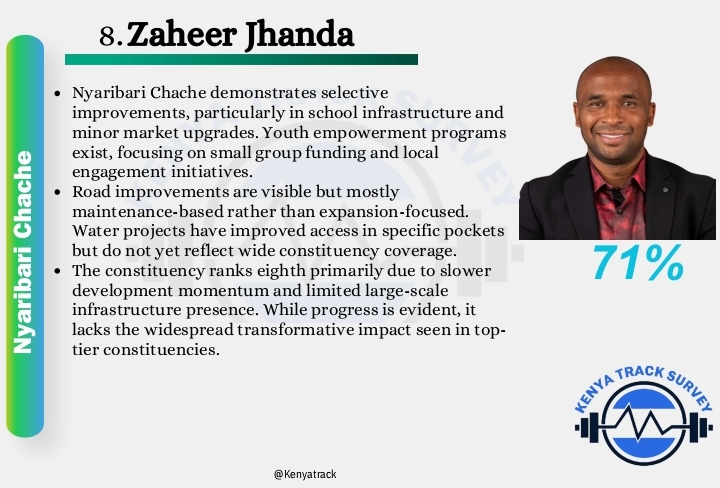 Nyaribari Chache MP Zaheer Jhanda ranks eighth with 71 percent, showing selective development progress including school infrastructure upgrades, youth empowerment programs and minor market improvements. Road projects remain largely maintenance-based while water initiatives have improved access in specific areas. The constituency’s development momentum remains slower compared to higher-ranked constituencies.