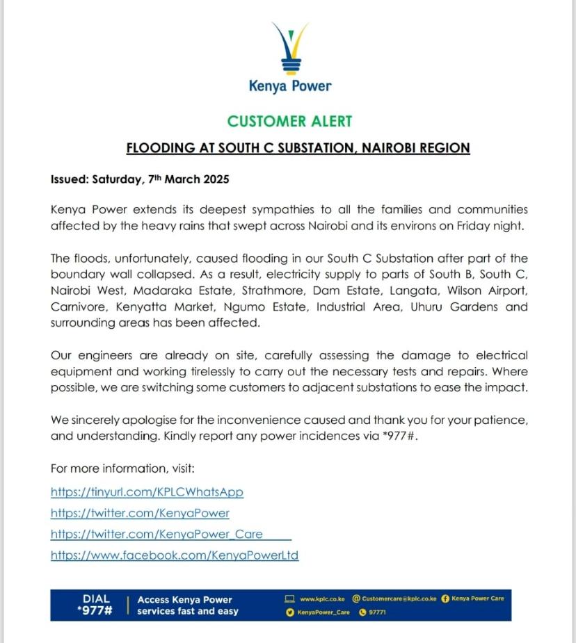 Kenya Power has announced that flooding at its South C Substation has disrupted electricity supply in several parts of Nairobi following heavy rains that pounded the city on Friday night.