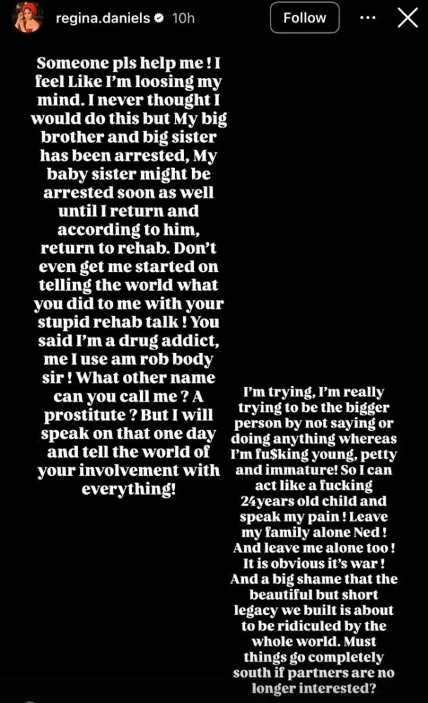 “You said I’m a drug addict, me wey just dey use am rob body, sir! What other name can you call me? A prostitute? But I will speak one day and tell the world of your involvement with everything! Leave my family alone, Ned! And leave me alone too!” she wrote.