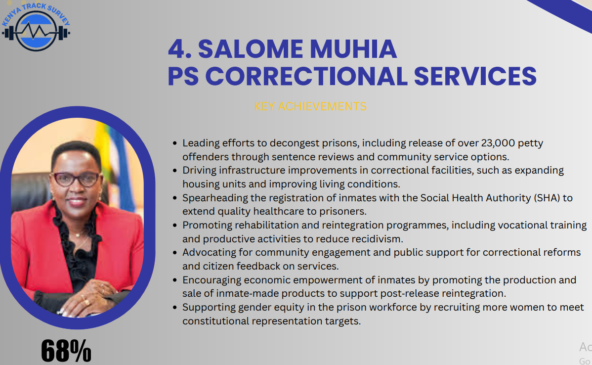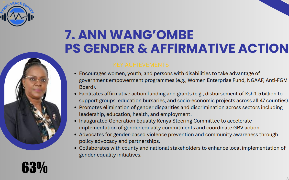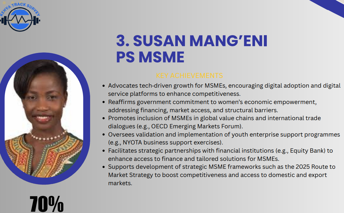 Micro Small and Medium Enterprises (MSME) Development PS Susan Mang’eni was ranked third with an approval rating of 70%. Kenyans, according to the survey, say that PS Mang’eni has advocated for tech‑driven growth for MSMEs, encouraged digital adoption and digital service platforms to enhance competitiveness.