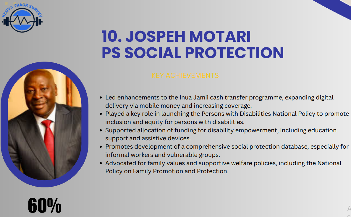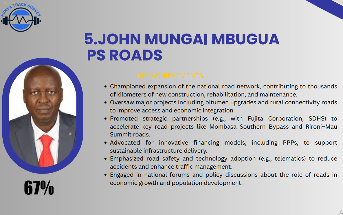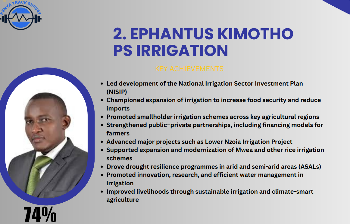 Irrigation PS Ephantus Kimotho was ranked second in the survey with an approval rating of 74%, with respondents saying that he led development of the National Irrigation Sector Investment Plan (NISIP), championed expansion of irrigation to increase food security and reduce imports and promoted smallholder irrigation schemes across key agricultural regions.
