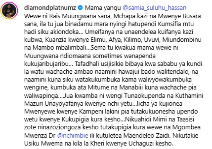Diamond Platnumz, the CEO of Wasafi Classic Baby (WCB), posted a long, heartfelt tribute to President Samia Suluhu Hassan. He praised her leadership qualities and hard work, while also acknowledging the challenges she faces.