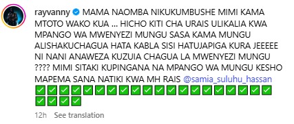 “Mama, allow me to remind you as your child that… you occupied that seat of the presidency by the plan of Almighty God. If God chose you even before we cast our vote, who can stop the choice of Almighty God???” — Rayvanny