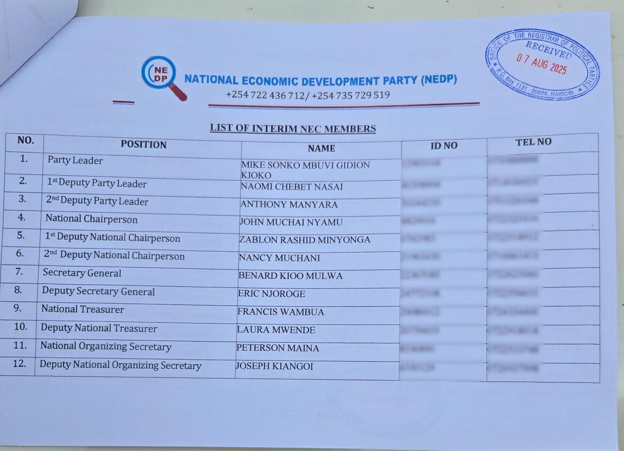Former Nairobi Governor Mike Mbuvi Sonko on Tuesday, December 9 morning received the Certificate of Full Registration for his newly-formed National Economic Development Party (NEDP) at the Office of the Registrar of Political Parties (ORPP) in Nairobi, marking a significant step in his political resurgence.