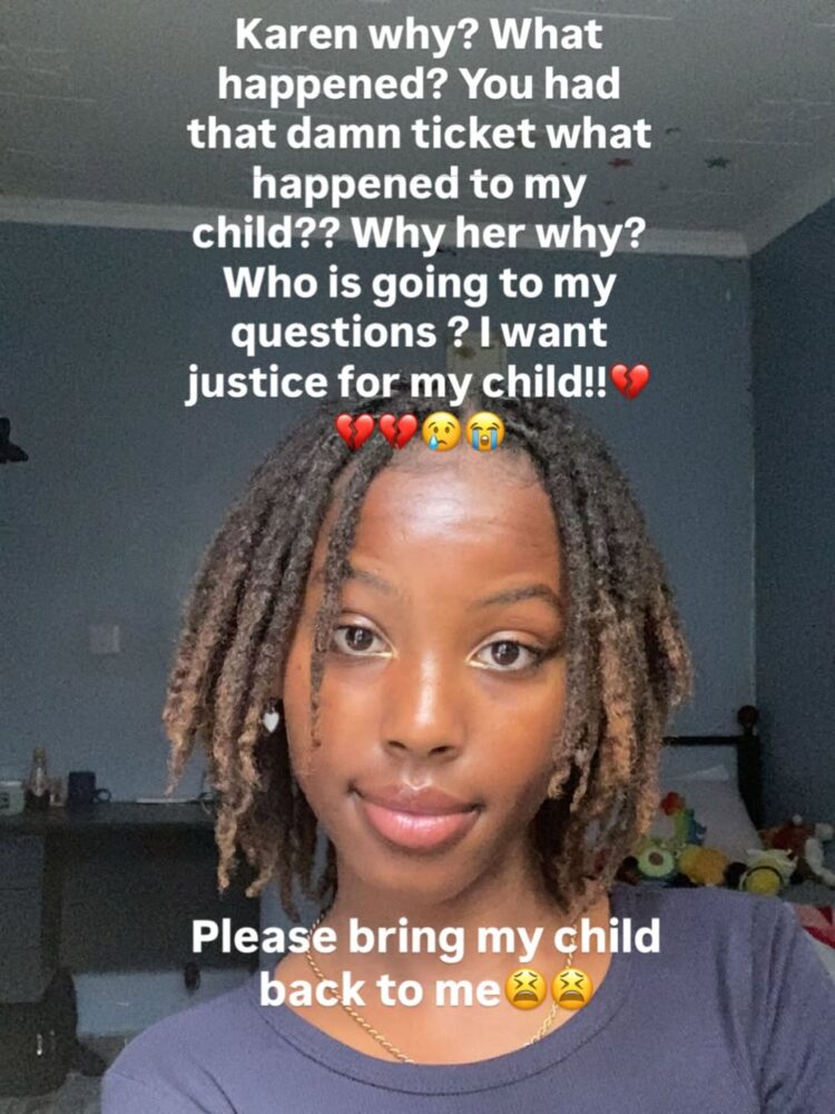 “Karen why, what happened? You had that damn ticket. What happened to my child? Why her, why? I want justice for my child. Please bring back my child,” she wrote.