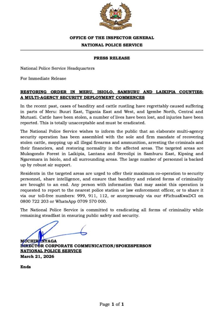The National Police Service has announced the rollout of a large-scale multi-agency security operation targeting rising cases of banditry and cattle rustling across parts of Meru, Isiolo, Samburu, and Laikipia counties.