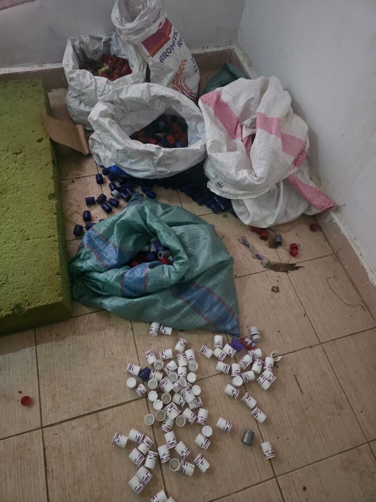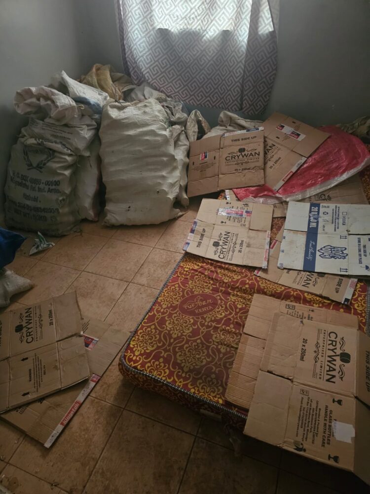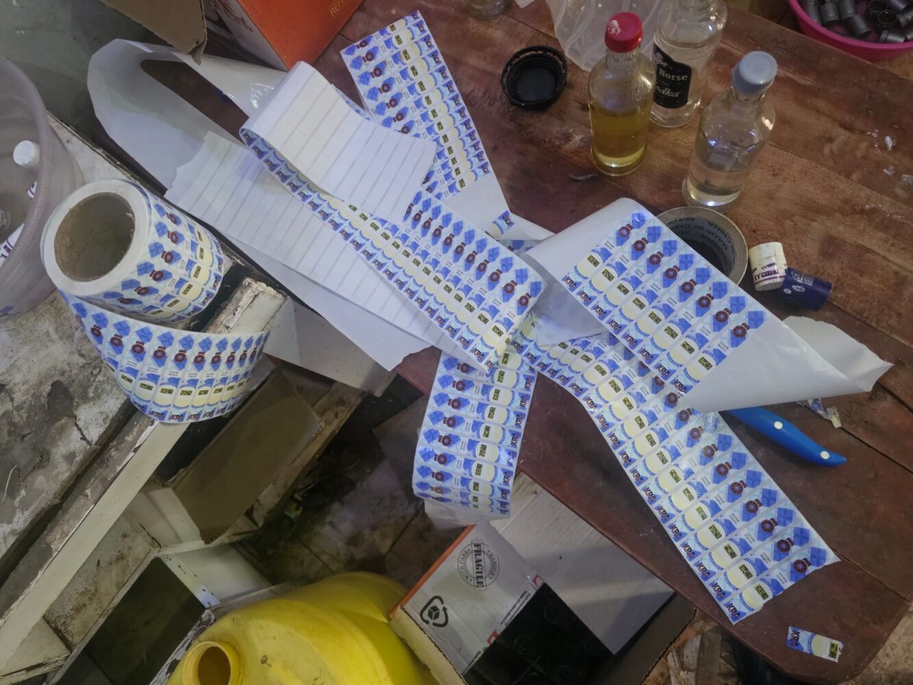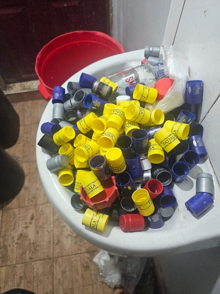 Operatives discovered large quantities of suspected industrial ethanol—a toxic substance unfit for human consumption—alongside food colouring used to mimic genuine products. The raid also yielded a full counterfeiting toolkit: paraphernalia for labelling and sealing, thousands of empty differently branded 250ml bottles and plastic caps, fake Kenya Revenue Authority (KRA) stamps intended to simulate tax compliance, and over 200 cartons of the finished counterfeit alcohol, packaged and ready to flood the market.