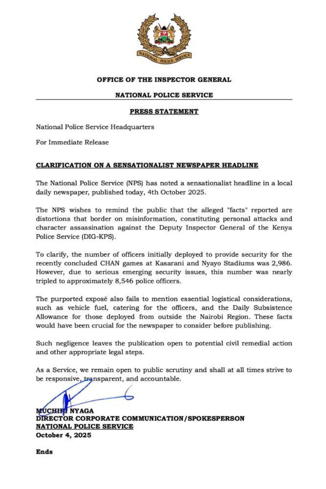 “The NPS wishes to remind the public that the alleged “facts” reported are distortions that border on misinformation, constituting personal attacks and character assassination against the Deputy Inspector General of the Kenya Police Service (DIG-KPS),” the NPS said in a statement on Saturday, October 4.