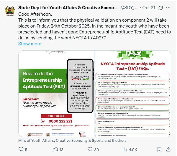The government has urged all youth preselected for the KSh50,000 NYOTA grant to complete the mandatory Entrepreneurship Aptitude Test (EAT).