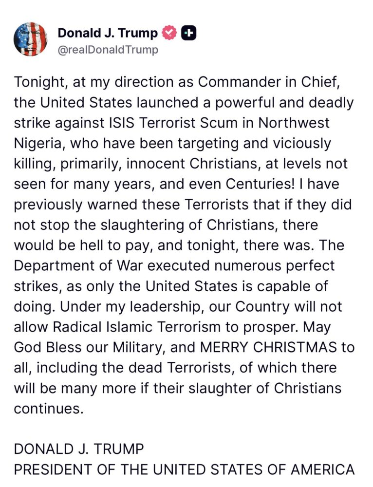 U.S President Donald Trump ignited global attention after posting a fiery Christmas-night message on Truth Social, announcing what he described as a decisive U.S. military strike against ISIS militants operating in Northwest Nigeria.
