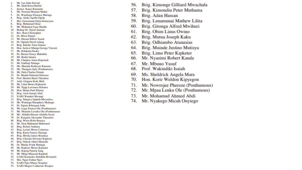 Recipients of the Second Class: Elder of the Order of the Golden Heart (E.G.H.) include Narok Governor Patrick Ole Ntutu, Attorney General Dorcas Oduor, Dr. Pratt Kristina Kenyatta, Cabinet Secretaries William Kabogo (ICT), Lee Kinyanjui (Trade), Deborah Mlongo (Environment) and entrepreneur Jaffer Mohamed Husein.