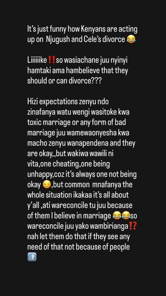 “It’s just funny how Kenyans are acting up on Njugush and Cele’s divorce,” she wrote, adding, “So wasiachane juu nyinyi hamtaki ama hamu-believe that they should or can divorce??”