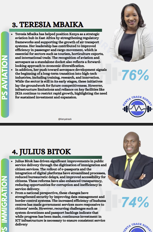 PS Teresia Mbaika ranks third with 24 percent, reflecting her role in strengthening Kenya’s position as a regional aviation hub and improving the efficiency of passenger and cargo movement, key to trade and tourism.