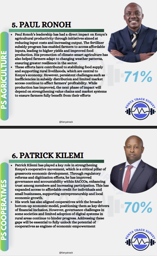 PS Paul Ronoh follows closely, with his fertilizer subsidy programme and climate-smart farming initiatives boosting productivity and supporting farmers across the country.