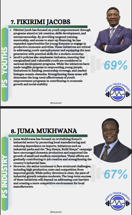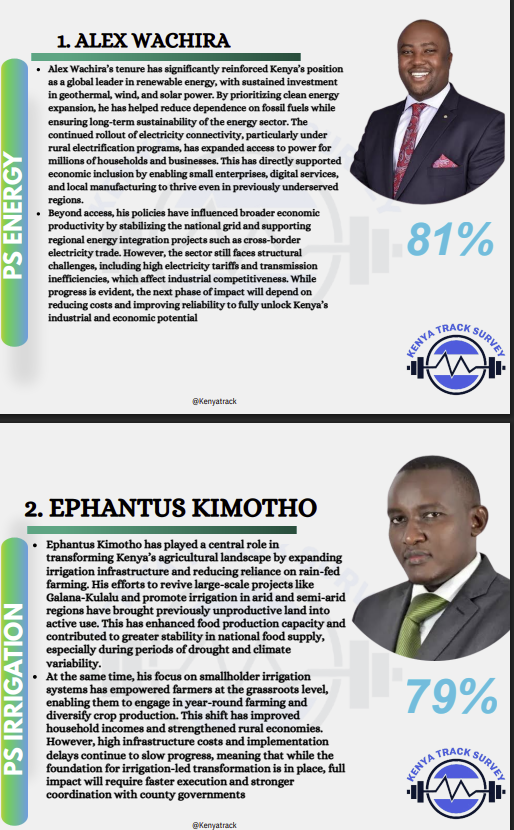 Leading the rankings is PS Alex Wachira, who emerged as the most impactful with a score of 34 percent. His tenure has been defined by a strong push toward renewable energy and expanded electricity access, positioning Kenya as a leader in clean energy while supporting growth in businesses and rural economies.