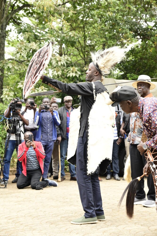 He was subsequently handed the traditional symbols of authority, which include a hide, a shield, a spear, and a three-legged stool items historically used by elders in the Luo community.