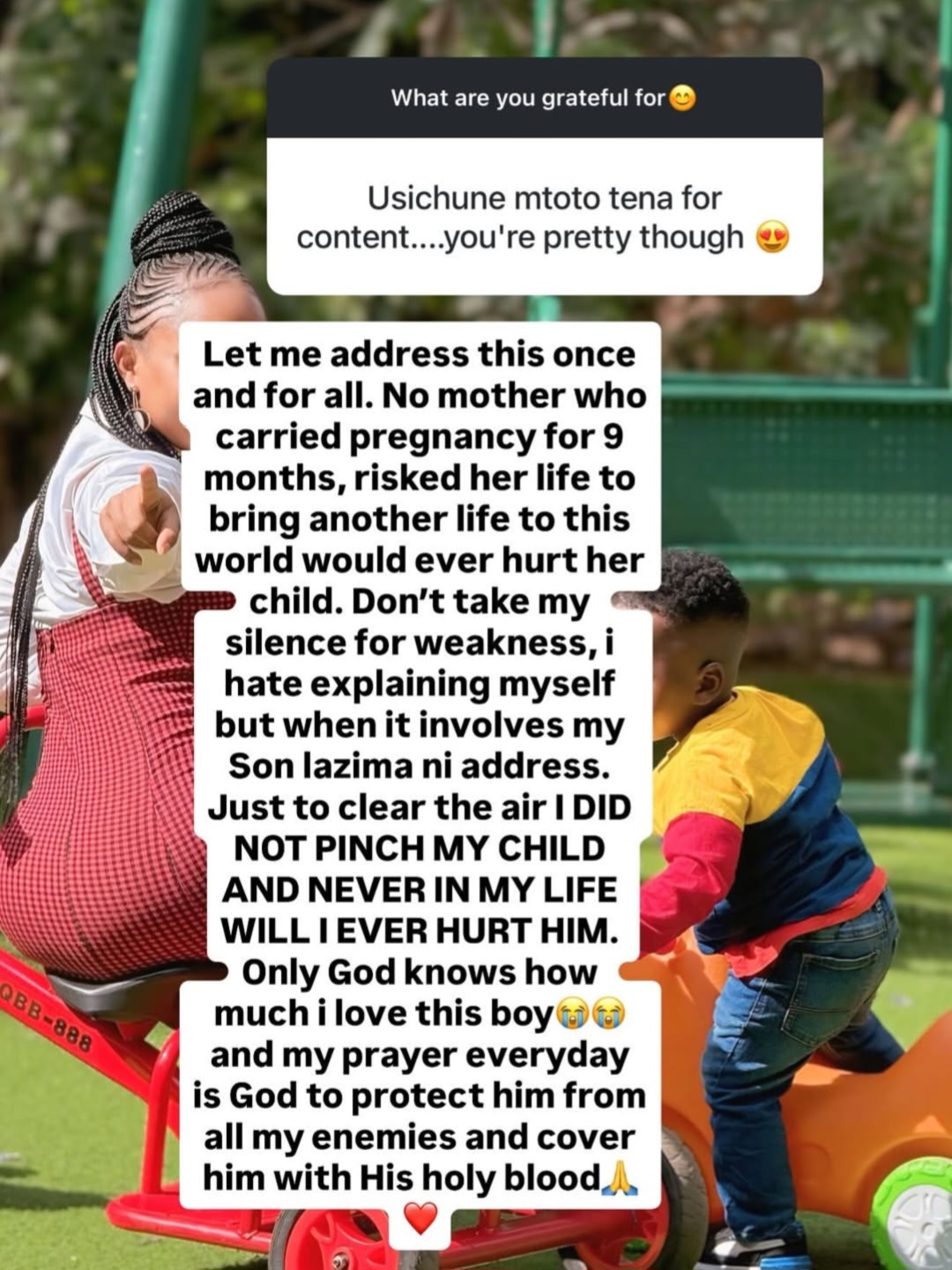 “Don’t take my silence for weakness. I hate explaining myself but when it involves my son lazima ni address,” she said.
