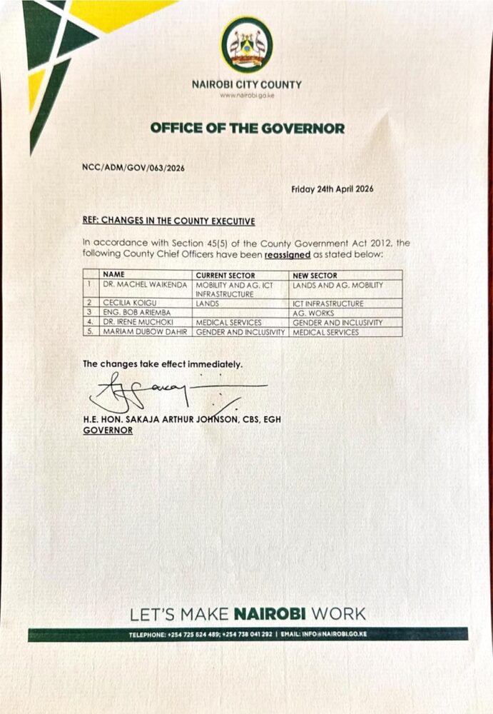 “In accordance with Section 45(5) of the County Government Act 2012, the following County Chief Officers have been reassigned,” part of the official communication read.