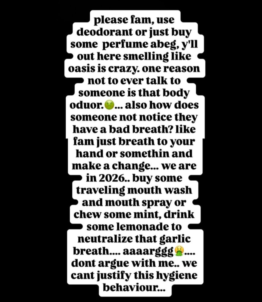 “Please fam, use deodorant or just buy some perfume abeg, y’all out here smelling like oasis is crazy,” he wrote.