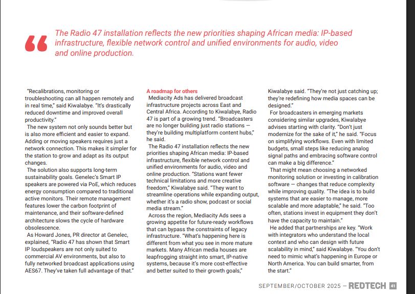 The article highlights the station’s groundbreaking studio upgrades in Nairobi, showcasing its transition to a fully IP-based infrastructure that is setting new standards for African broadcasters. The REDTECH piece, focuses on Radio 47’s collaboration with Rwanda-based systems integrator Mediacity Ads Ltd. to build an all-IP setup from the ground up.