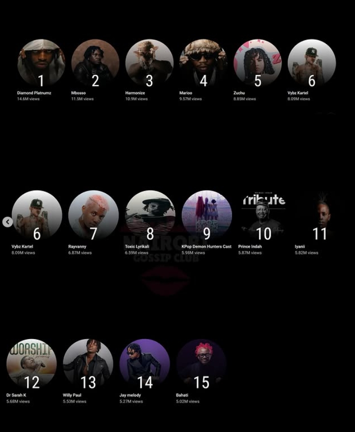 The final rankings for the most-watched Kenyan artists on YouTube for this period are as follows: