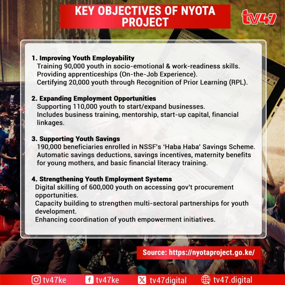 One such programme is the National Youth Opportunity Towards Advancement (NYOTA) programme, which targets 820,000 youths aged 18 to 29 years, offering business grants, skills training, and digital courses to improve access to government opportunities.