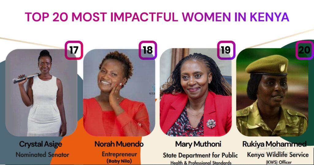 Others named in the list include Auditor-General Nancy Gathungu, TVET specialist Peninah Ngina, journalist Mwanaisha Hamadi, digital strategist Pauline Njoroge, businesswoman Damaris Muriithi (Dama wa Spares), musician Crystal Asige, and human rights defender Rukiya Mohammed, comedian Mamito, among others.