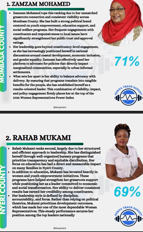 Topping the list in a commanding and undisputed fashion is Mombasa Woman Representative Zamzam Mohamed, who leads the national rankings with an impressive 71 percent approval rating.