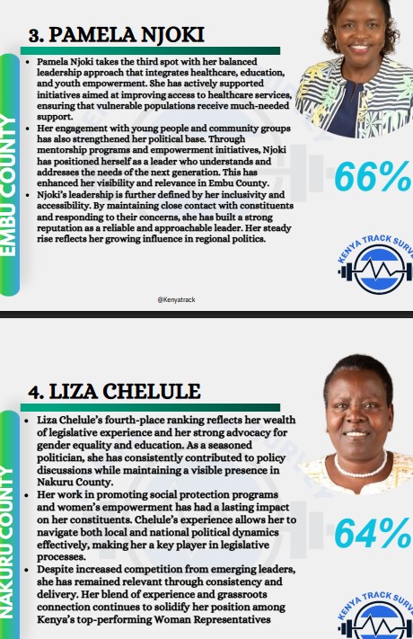 Embu Woman Representative Pamela Njoki, popularly known as Hon Double N, secures the third position with 66 percent, driven by a deeply human centered and transformative leadership philosophy.