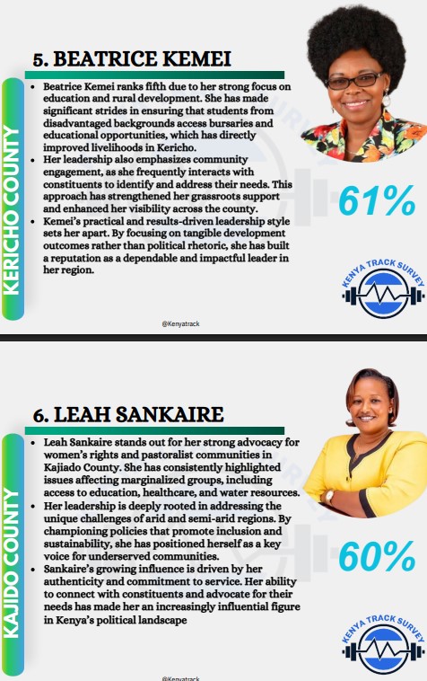 Kericho Woman Representative Beatrice Kemei rounds off the top five with 61 percent. Her leadership is defined by a pragmatic focus on education access and rural development.