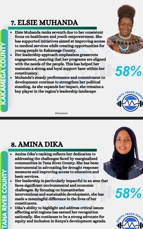 Elsie Muhanda of Kakamega takes the seventh position with 58 percent, recognized for her steady focus on healthcare advancement and youth empowerment. Her grassroots driven approach has enabled her to maintain strong alignment with the needs of her constituents, reinforcing her political stability.