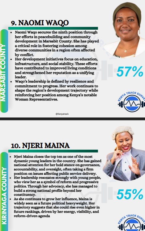 Closing the top ten is Kirinyaga Woman Representative Njeri Maina with 55 percent. As one of the youngest leaders in the ranking, she has rapidly gained national attention for her bold stance on governance, accountability, and oversight. Her growing influence reflects a generational shift toward reform driven leadership that resonates strongly with the youth.